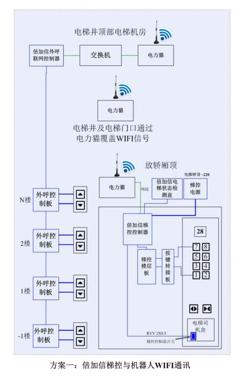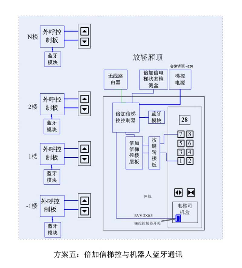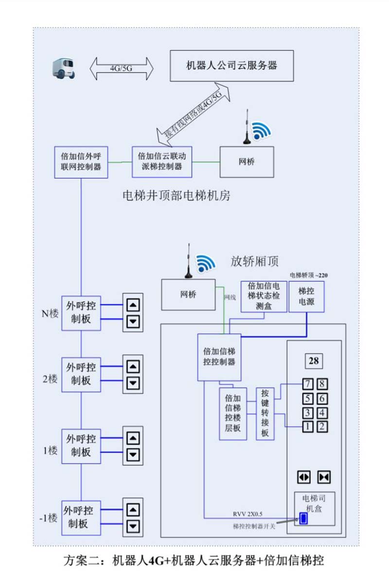 (1)機器人在電梯外,通個Wifi、藍牙、LoRa、Zigbee、2.4G、433M、語音或4G網絡等發送指令倍加信梯控系統,系統自動點亮上樓或下樓按鍵,實現呼梯功能。
