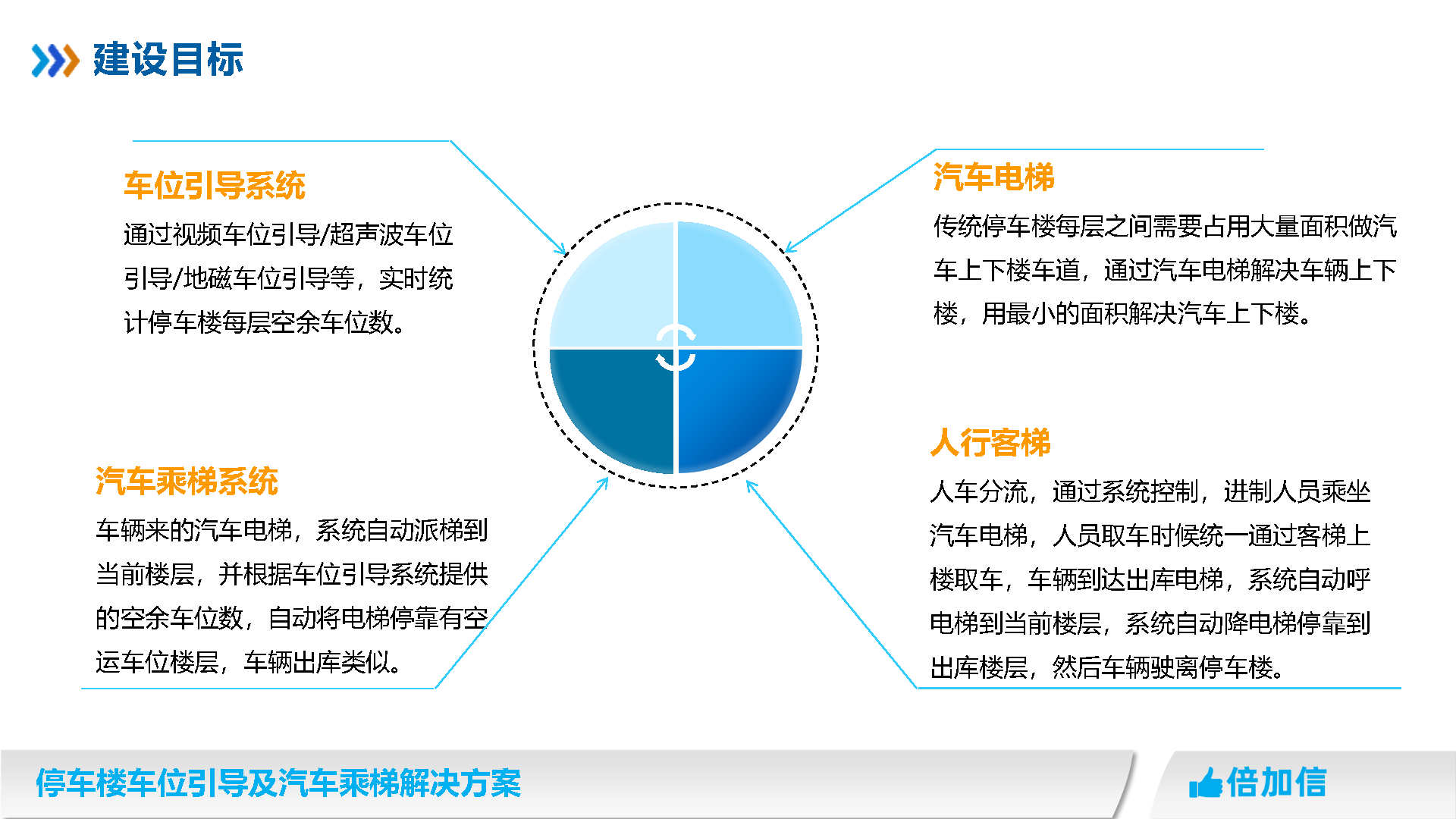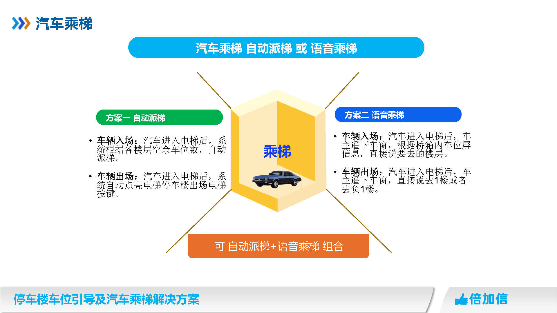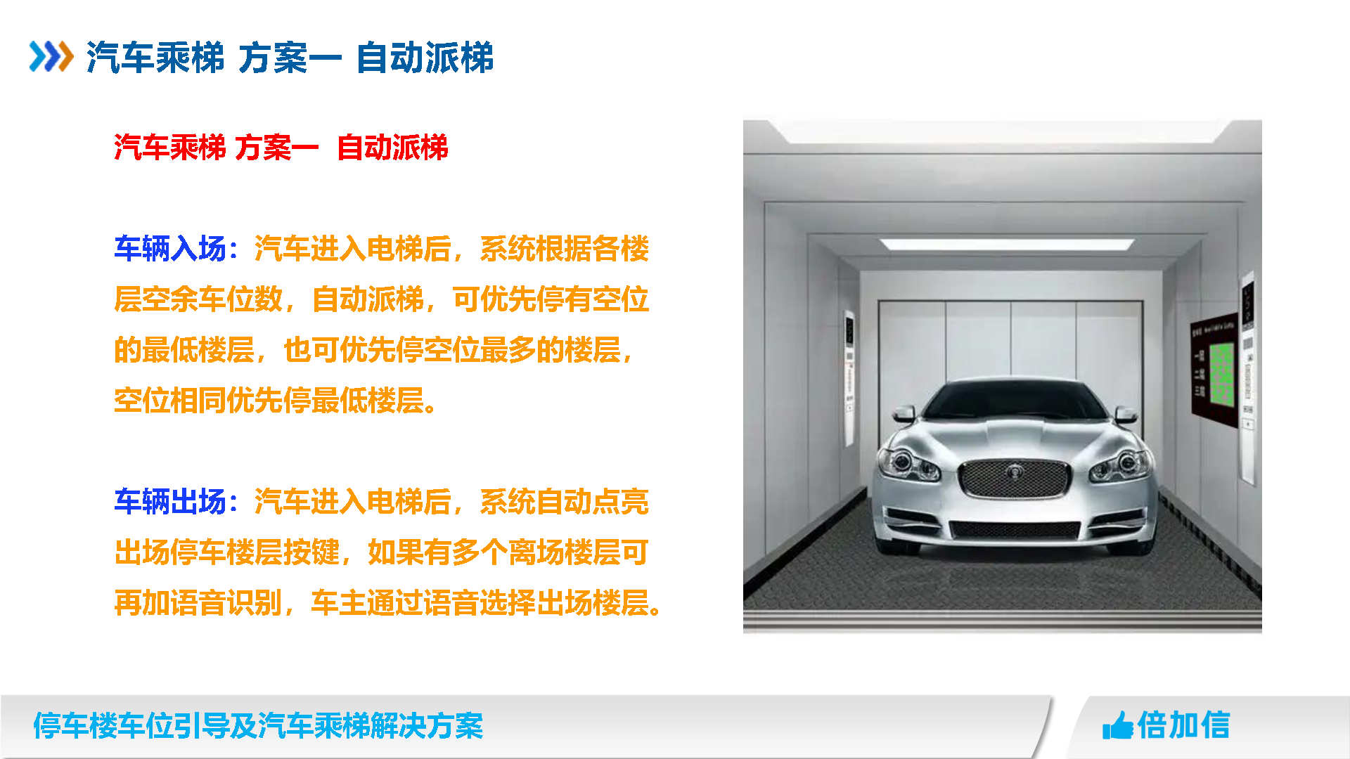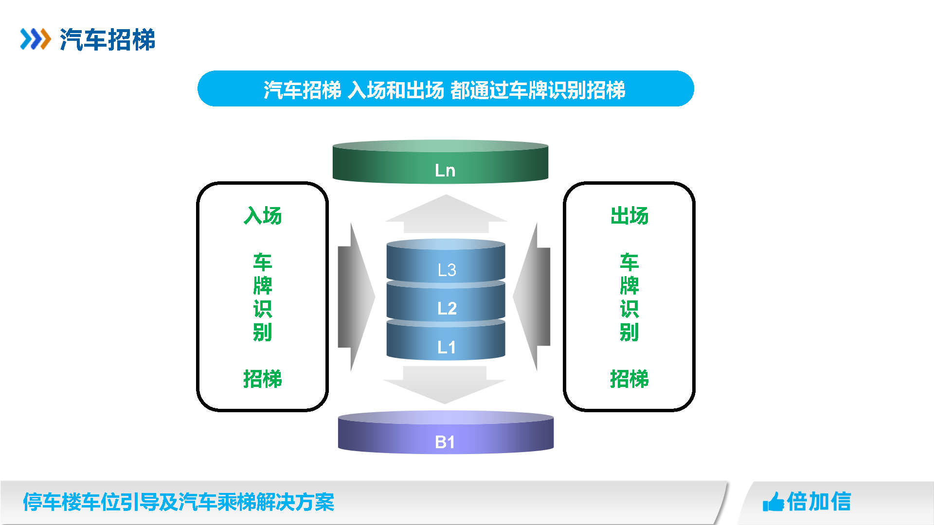 倍加信汽車乘梯系統方案優勢 1、通過視頻/超聲波/地磁,實時獲取停車樓各樓層空余車位數/ 2、入庫電梯屏、電梯橋箱屏、分區引導屏實時引導車主停車 3、車牌識別自動呼叫電梯到達當前樓層,包括入場乘梯和離場乘梯 4、不需要電梯提供協議,汽車派梯系統可自動根據各樓層空余車位數,自動派梯 5、不需要電梯提供協議,可實時獲取電梯當前?繕菍印㈦娞萆舷滦袪顟B、開關門狀態 6、不需要電梯提供協議,可語音識別招梯和乘梯,包括客梯也可以語音乘梯 7、不需要電梯提供協議,可實現汽車電梯禁止人員乘梯,包括內呼和外呼都禁止 8、可自動派梯和語音乘梯組合使用,特別是離場樓層有多層情況車主可自己選擇樓層 9、汽車乘梯過程可禁止其他汽車招梯,防止電梯未到達指定樓層就? 10、可在電梯門口增加紅綠指示燈,顯示當前汽車電梯是可用或正在使用狀態 11、電梯提供協議,也可以與電梯協議對接實現上面所有功能