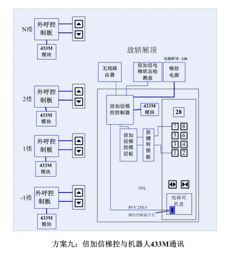 (4)倍加信機器人433MHz通訊乘梯系統(tǒng)可廣泛應(yīng)用于各種品牌電梯,且不影響電梯原有按鍵功能。