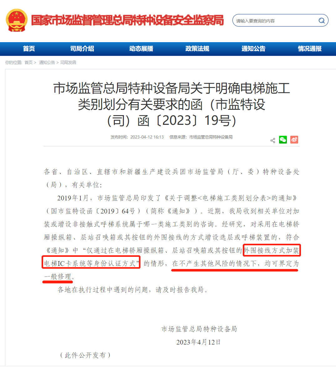 2023年4月12日市場監管總局特種設備局再次發函,按鍵方式加裝梯控屬于一般修理。